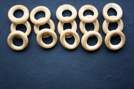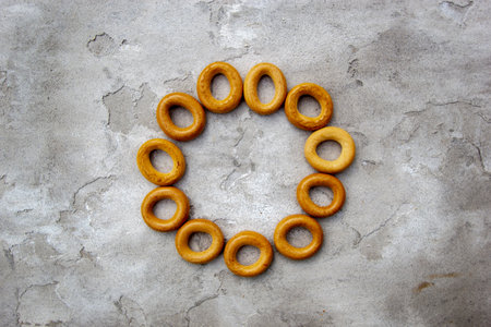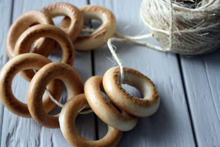 Sushki on a gray background. Traditional Russian bread product of low moisture in the shape of an oval