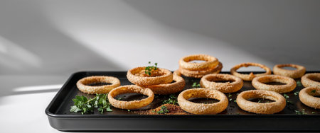 AI Generated. Crispy Onion Rings Served on Black Baking Tray with Herbs and Spices