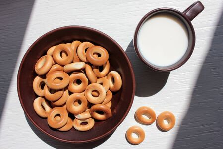 Milk in a brown ceramic cup and small dry bagels for kids on white wooden background. First solid finger food for baby. Healthy meal
