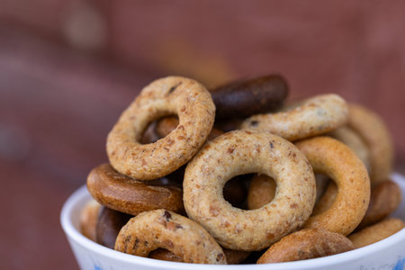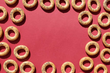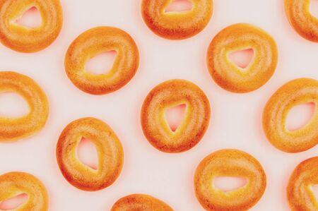 Baked bagels, crispy dried products, sweet flour dessert. Background for text.
