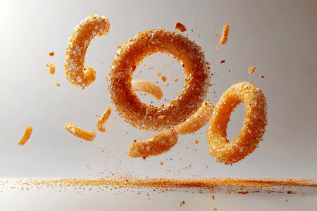 Floating Onion Rings in Motion with Crumbs and Seasoning Explosion