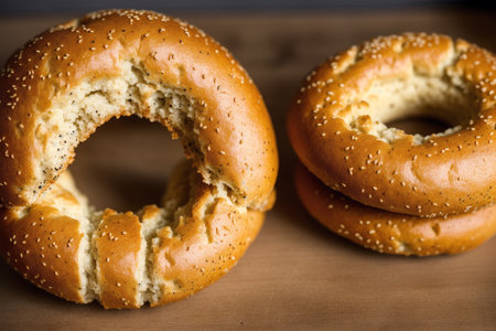 Traditional Turkish crispy bagel with sesame, simite. Freshly baked buns. View from above. Sweet homemade pastries. Breakfast. Background. Food.