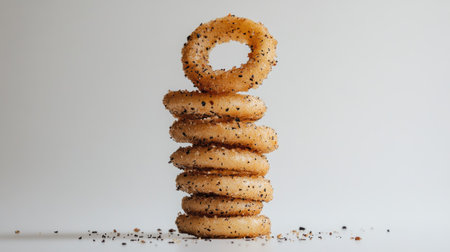 Stack of onion rings topped with visible seasoning flakes, centered on a plain white background