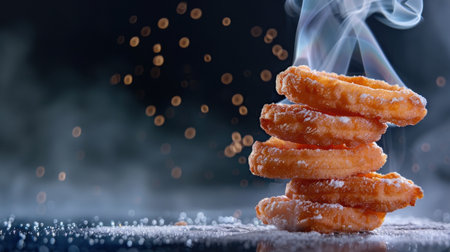 A visually stunning image of crispy golden churros stacked with sweet cinnamon sugar, creating an appetizing scene of indulgence and warmth.