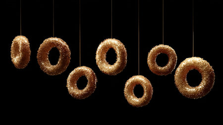 Golden donuts hanging on a rope on a black background. 3d rendering