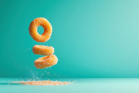 A visually captivating image of floating donuts surrounded by sprinkle particles, set against a vibrant green background. The scene showcases a playful and artistic representation of these sweet treats, ideal for food lovers and dessert enthusiasts.