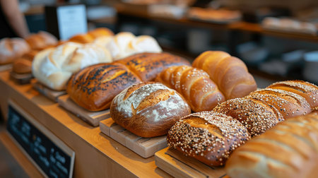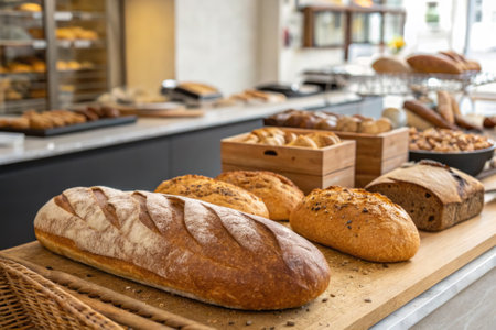 Freshly baked loaves of various breads are elegantly arranged on a wooden counter in a contemporary bakery. The inviting atmosphere is complemented by natural light.