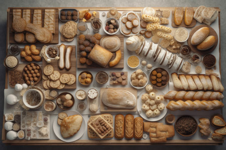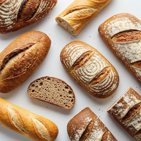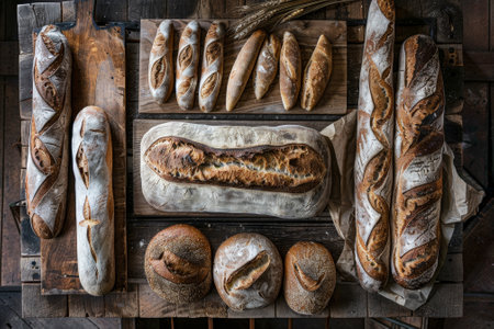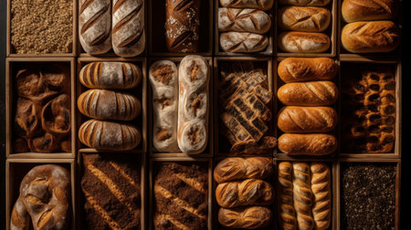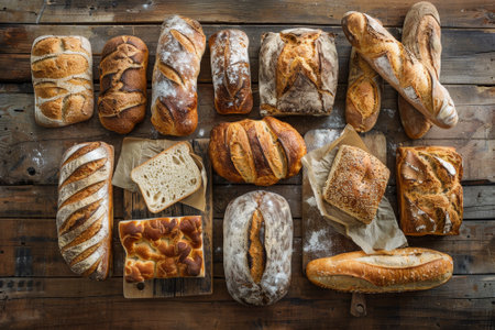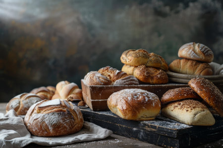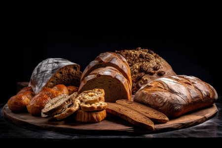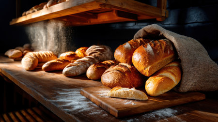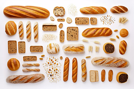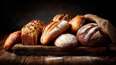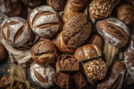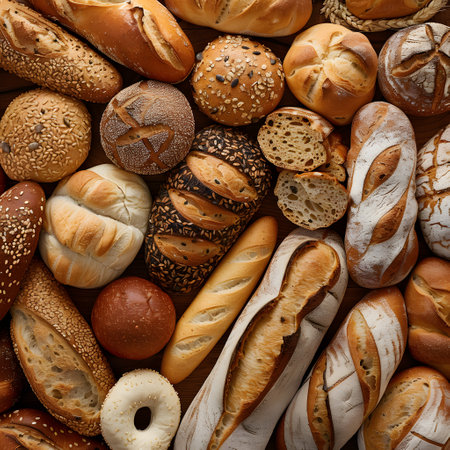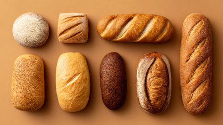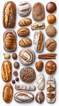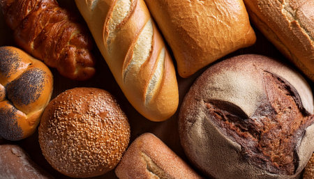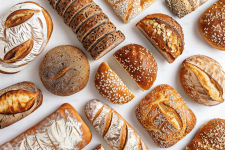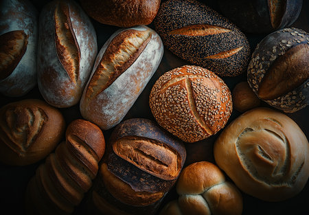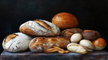 A beautiful arrangement of various bread types showcasing unique textures and colors. Perfect for culinary themes, recipe illustrations, and bakery displays.