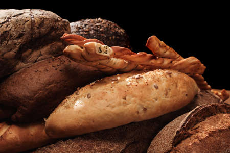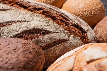 Many various wholegrain baked breads top view close-up