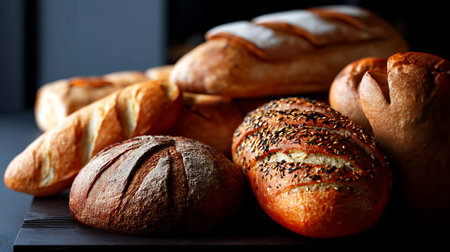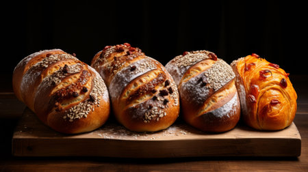 Assortment of rustic breads showcased on dark wooden board, a tantalizing bakery display