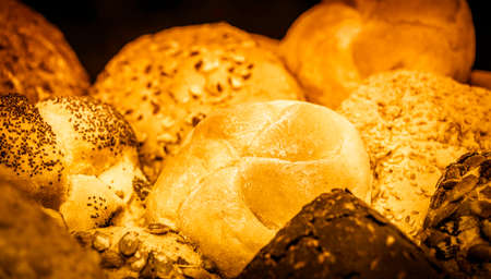 Assortment of golden loafs of bread and bread rolls