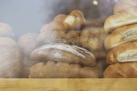 Assorted bread in shop window, low contrast