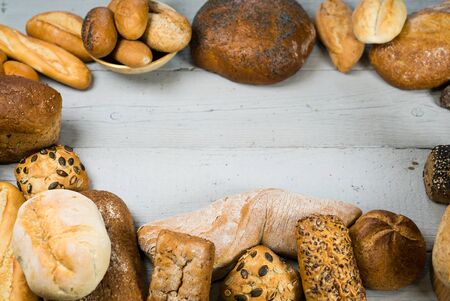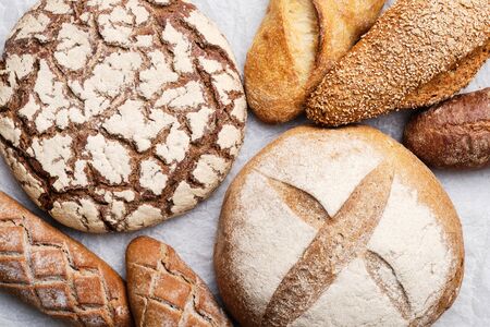 Flat lay bread background. Freshly baked assortment of bread.