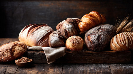 Artisan Bread Still Life with Croissant and Wheat on Rustic Wooden Surface