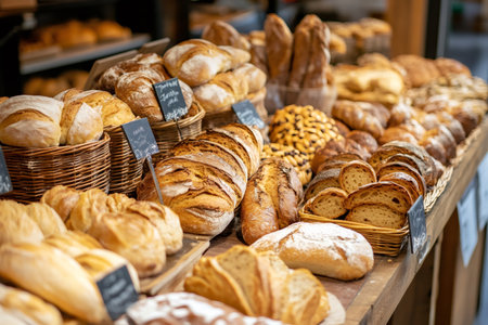 A vibrant scene of a bakery display filled with various types of bread, including baguettes, sourdough, and pastries, inviting customers to indulge in freshly baked goods.