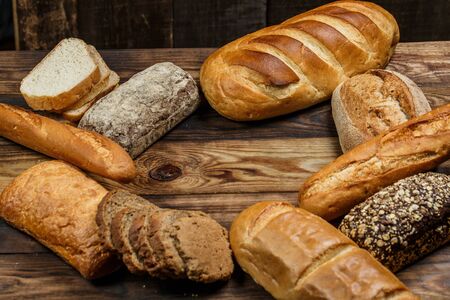 Fresh baked bread with a golden crust, loaf, buns, white, rye on a rustic wooden background with sil rustic. Flat layout