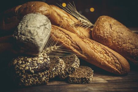 Different types of fresh bread and bakery on the table.