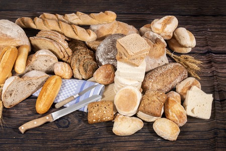 Variety of bread on old wooden table
