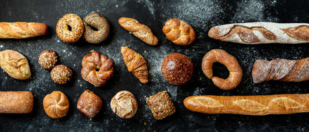Bakery - different kinds of breadstuff. Bread rolls, baguette, bagel, burger bun and croissant captured from above (top view, flat lay). Black chalkboard background, horizontal banner layout.
