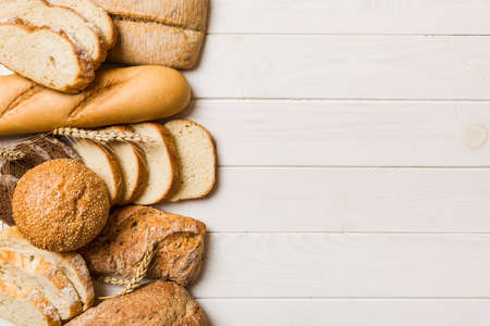 Homemade natural breads. Different kinds of fresh bread as background, top view with copy space.