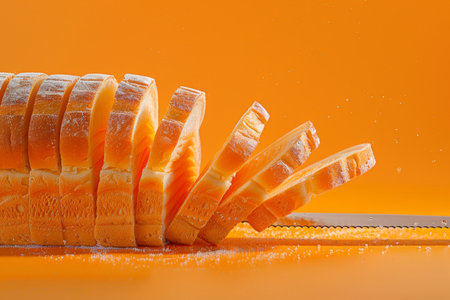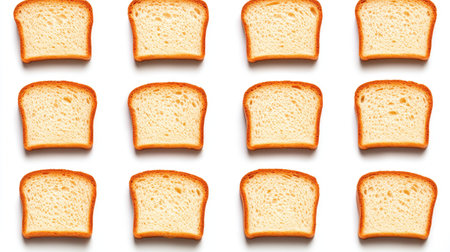Sliced white bread with a golden crust and airy interior, arranged in a row. Clear details and vibrant colors ...