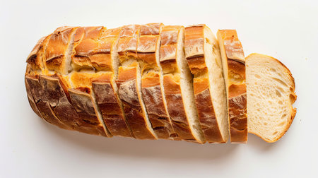 Sliced baguette, crisp crust and soft interior, isolated on white background.