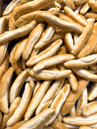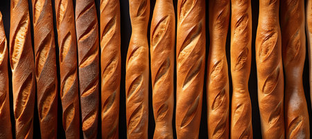 French Baguettes in bakery store. Freshly baked loaves on bakery racks. Baked goods and bakery context. Tasty french baguettes arranged in rows in bakery.