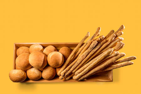 Crusty bread rolls, bread sticks with sesame and poppy seeds in wooden tray, isolated on yellow background in top view, copy space