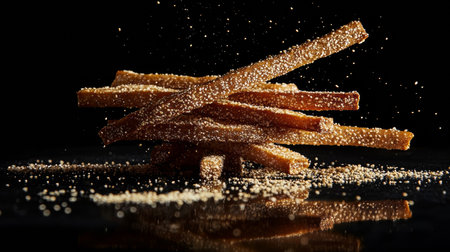 A stunning closeup of bright yellow snack sticks piled on a wooden table surface. The dark background enhances the colors, creating an enticing food photography experience.