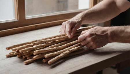 The man binds the grissini with an eco-friendly rope. A set of breadsticks