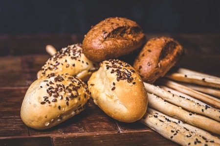 Top view of various kinds of bread on a wooden surface. Close up Concept of homemade bread, small bakery, natural farm products, local food, domestic production. Healthy and tasty organic food.