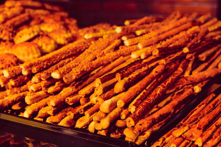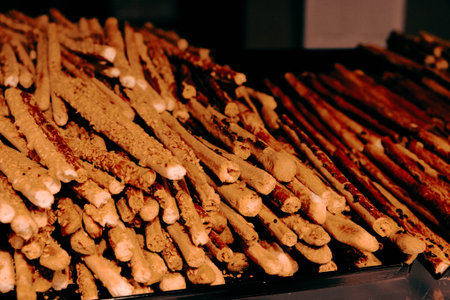 Salty bread strips spread out delicious snack surface texture. Close-up, selective focus.