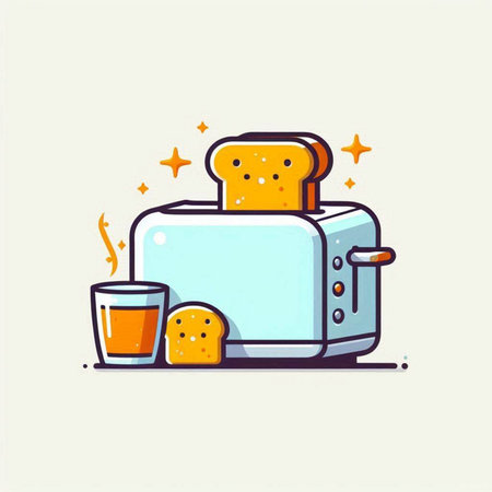 A toaster is on the table. Toasted bread slices jump out of the toaster. Sandwich toasts. Flat style.