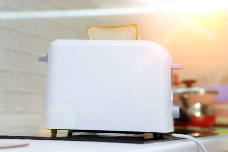 white toast bread in two-slot automatic electric toaster. making toast for Breakfast