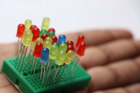 Group of colorful LED bulbs pinned to breadboard and held in hand isolated on white background