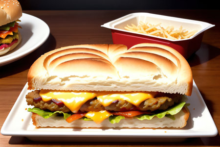 A row of hamburgers and fries are piled on top of each other. The hamburgers are topped with cheese and lettuce, and the fries are golden brown. Concept of abundance and indulgence