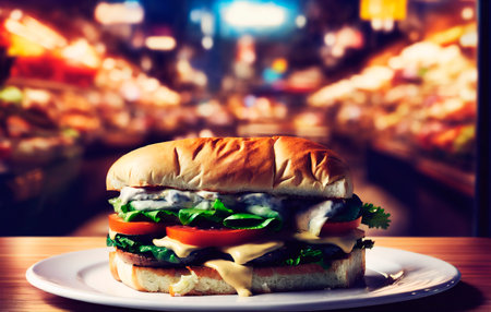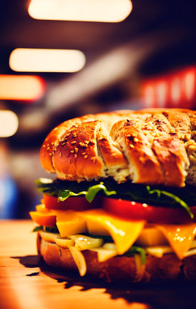 Burger with sesame seeds. Grilled cheese and meat. Fast food cafe commercial.