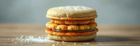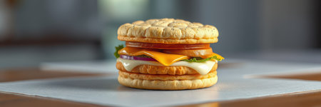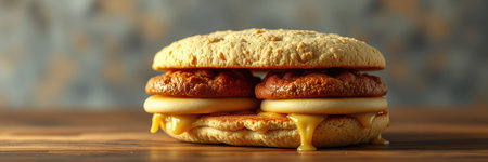 Delicious sandwich with layers of soft cookies and melting cheese on a wooden table in a cozy setting