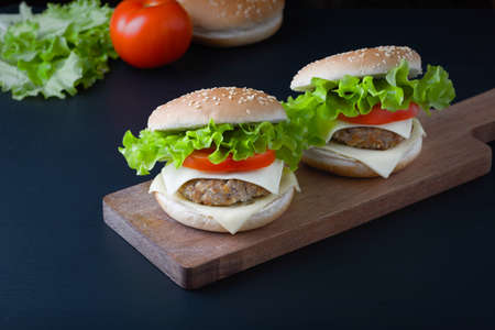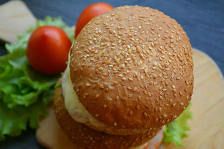 Fresh delicious homemade burger or hamburger with juicy meat, cheese and vegetables, fast food, macro photo.