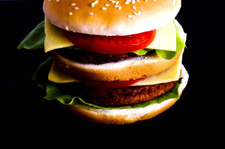 Detail of beef cheeseburger with melted cheese isolated on black background.