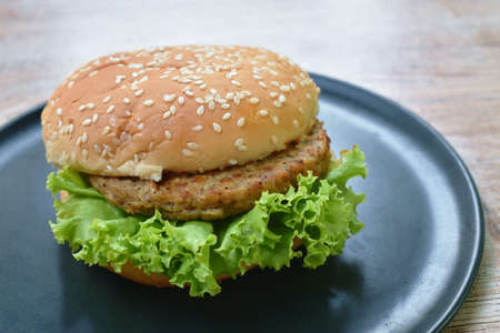 Close-up of a standard burger. Adult fast food in a restaurant or cafe. Macro photo of burger ingredients with meat, cheese and herbs. Eco burgers for the whole family