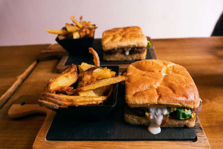 Burgers on a wooden board with potatoes. Tasty photo fast food. Place for text.
