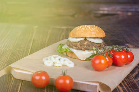 Classic american fast food background. Burger whole grain bun with grilled on barbecue ground beef cutlet on wood in craft paper. Hamburger with fresh vegetables composition. Filtered