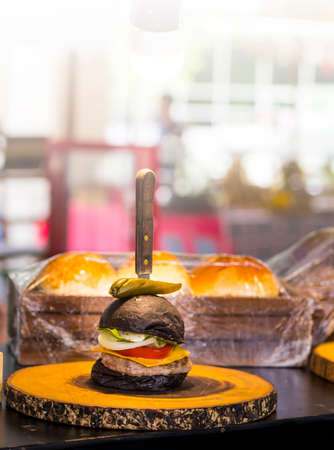 Black burger buns with chees and pickle at the local shop in the market Thailand, unhealthy food, fast food