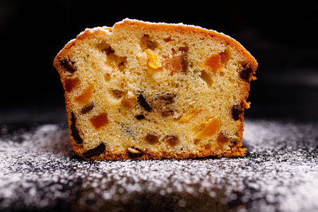 Christmas fruitcake powdered sugar on white plate dark background seasonal decorations. Xmas atmospheric greeting card. Festive pastry baking Stollen cake dough recipe ingredients dried candied fruits