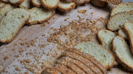 Toast presented in abstract fashion with artistic arrangement of crumbs and crusts