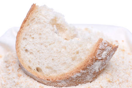 a piece of bread, crust on the table in crumbs, untidily scattered
