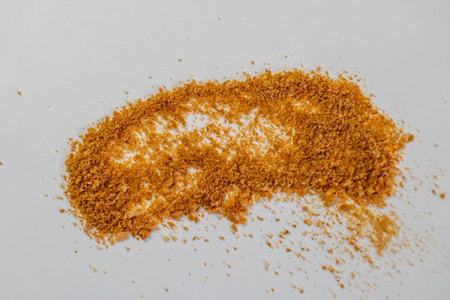 Golden breadcrumb pile on white backdrop. Perfect for food blogs, recipes, and culinary projects.