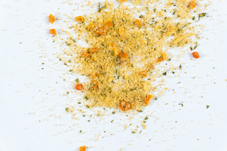 Scattered all-purpose seasoning from a mixture of vegetables and salt on a white background.