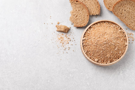 Fresh bread crumbs in bowl on gray table, flat lay. Space for text